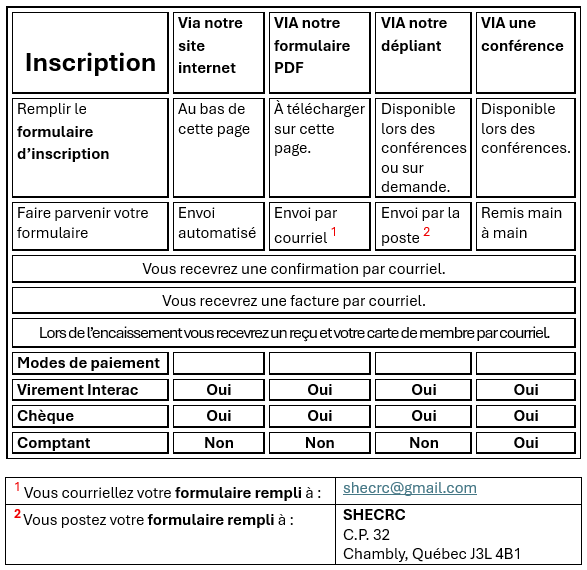 - Pour connaître les responsabilités des postes ou pour de plus amples renseignements, contacter Jocelyne Côté, registraire, à : shecrc@gmail.com ou par téléphone au 514 781-0806.